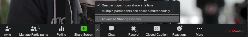 The first rule of Zoom is don’t give up control of your screen. The host and lead/speaker should be the only people who can share their screen. You do not want random people in your public event taking control of the screen and sharing unwanted content with the group. You can restrict this — before the meeting and during the meeting in the host control bar — so that you’re the only one who can screen-share. Using the host controls at the bottom, click the arrow next to Share Screen and then Advanced Sharing Options.