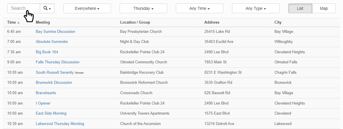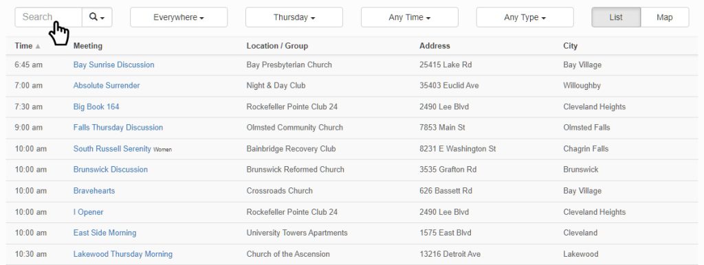 This is the default state when the page loads. Use this option to find meetings by name, location (venue) name or street name. The less information you use, the better. Example: Searching for keyword Club will provide more results than Recovery Club. If you aren’t getting enough results, try selecting Any Day from the Day dropdown menu.