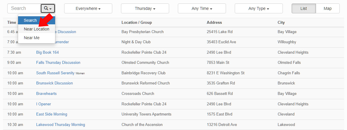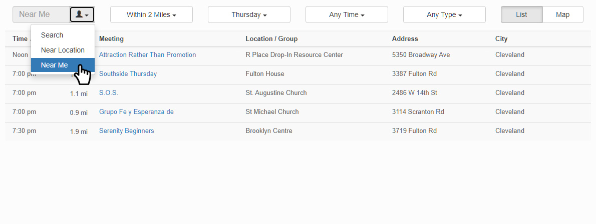In the first search option, click the down arrow and select Near Me to allow the web browser to use your location information to automatically find meeting around your immediate area. Similar to using GPS, but instead of relying on satellites, it uses Wi-Fi networks and access points to pinpoint your location. Accuracy may vary.