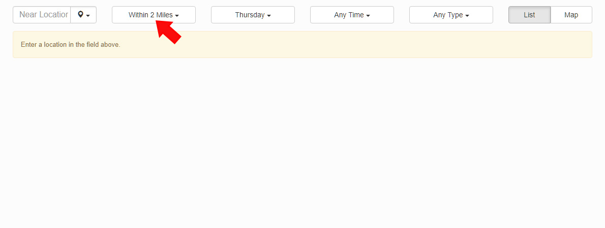 In the first search option, click the down arrow and select Near Location to search by zip code. This will also allow you to expand the radius around the zip code.
