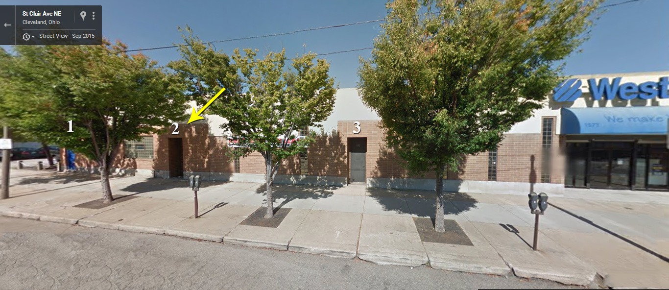 - Back: Free parking is available behind the building. From St Clair Ave, take E 13th or E 17th north to Canfield Ct and look for the circle/triangle sign on the brown garage door.