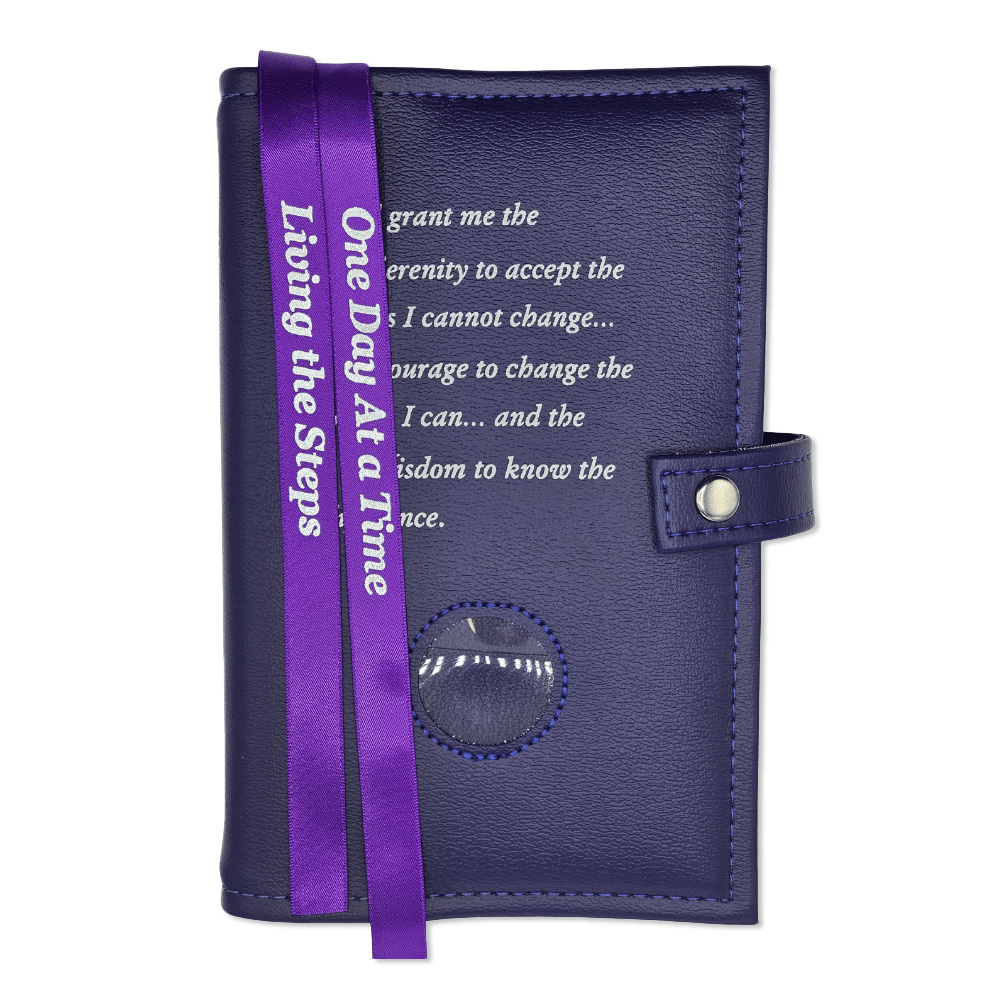 This high-quality cover features the Serenity Prayer silk-screened on the front, offering daily inspiration every time you pick up your book. A built-in transparent medallion holder lets you proudly display your favorite recovery coin (coin not included), making it uniquely personal to your journey.