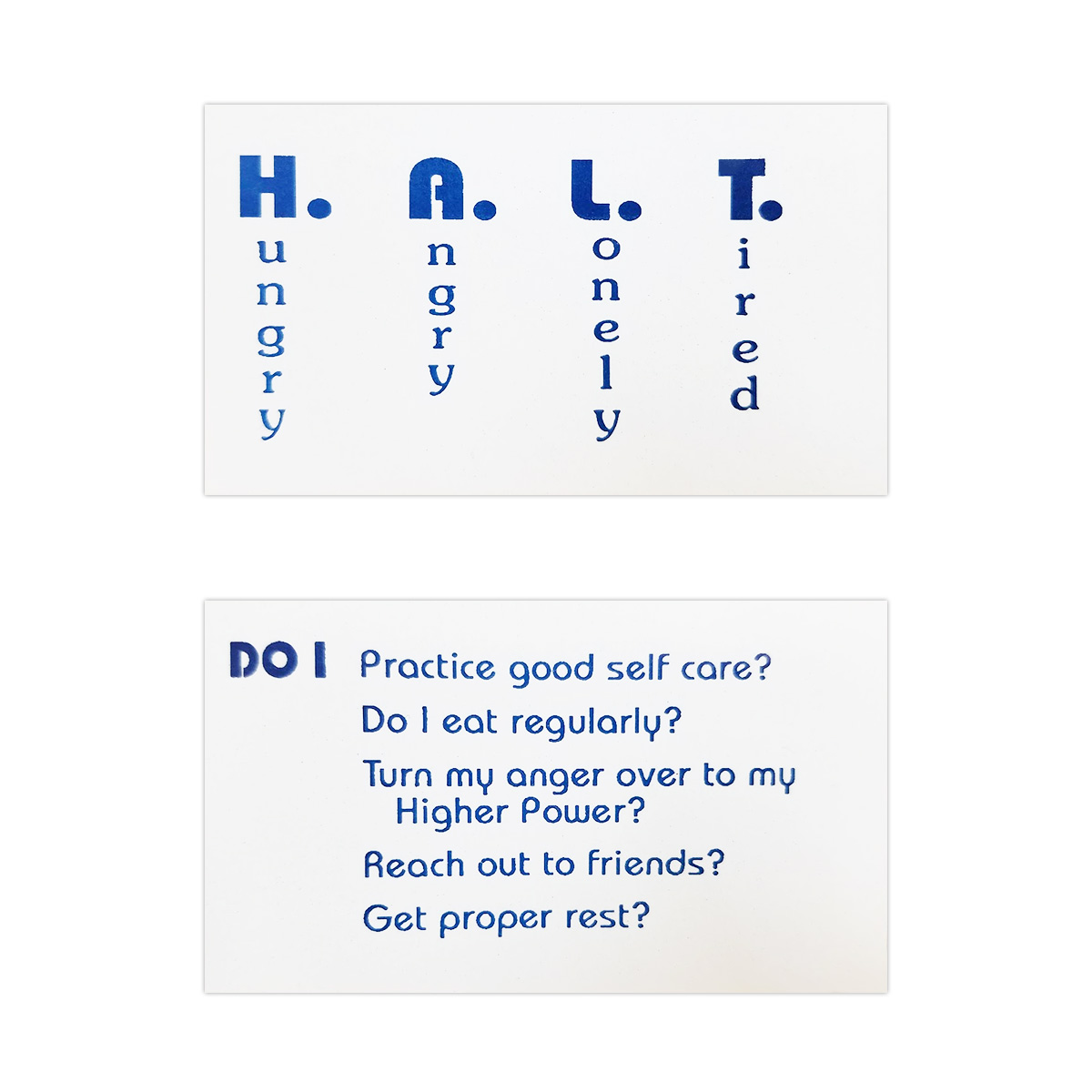 A wallet card with the acronym – Hungry, Angry, Lonely, Tired. Complete with corresponding questions on the reverse side.