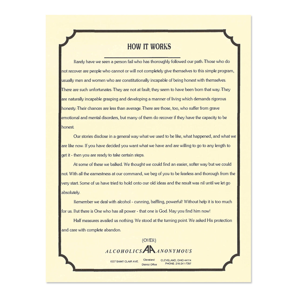 An excerpt in large type from Chapter 5 of the Big Book. This page, which includes the Twelve Steps, is often read at the start of meetings.