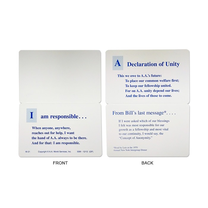 Front of card includes the "I am responsible…" pledge. Back includes the "Declaration of Unity," and an excerpt from Bill's last message.