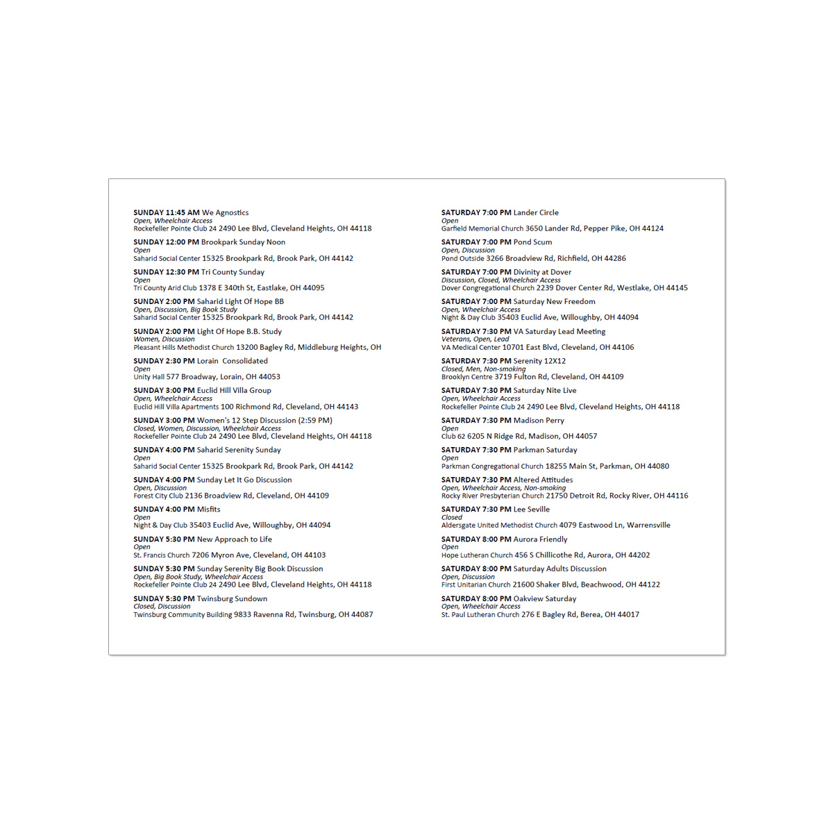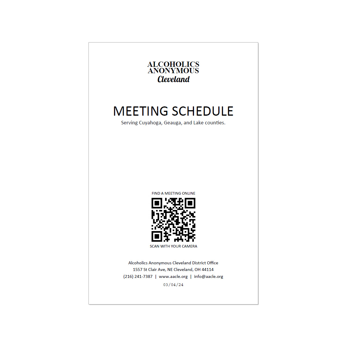If you wish, the AA Cleveland District Office will mail one meeting schedule to you free of charge. Simply call or email your name and address along with your request.